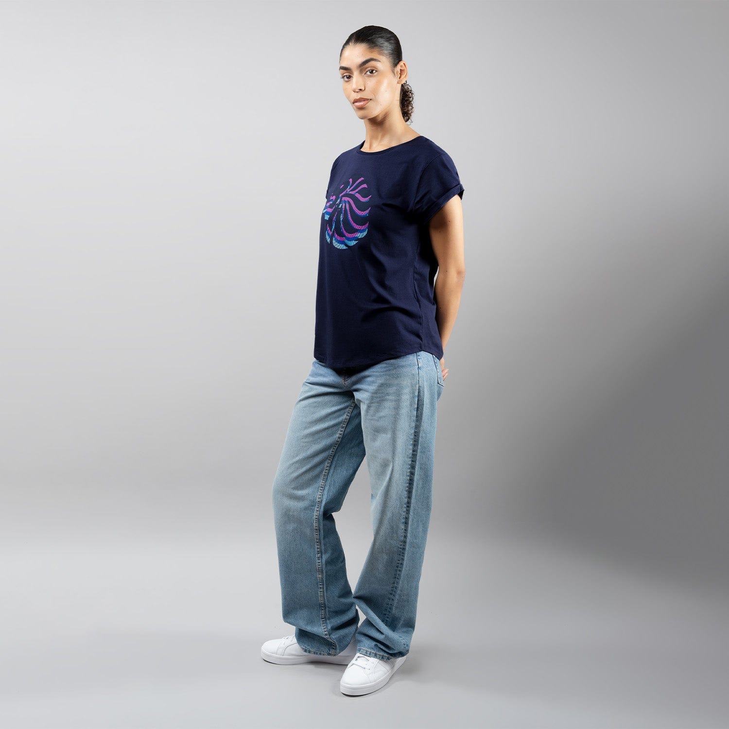 Cheer on Team GB in style with the Team GB Stacked Large Lion Graphic T-Shirt in Navy (Female). This tee offers a flattering fit and proudly displays the stacked Team GB and large lion graphic, making it a comfortable and spirited choice.